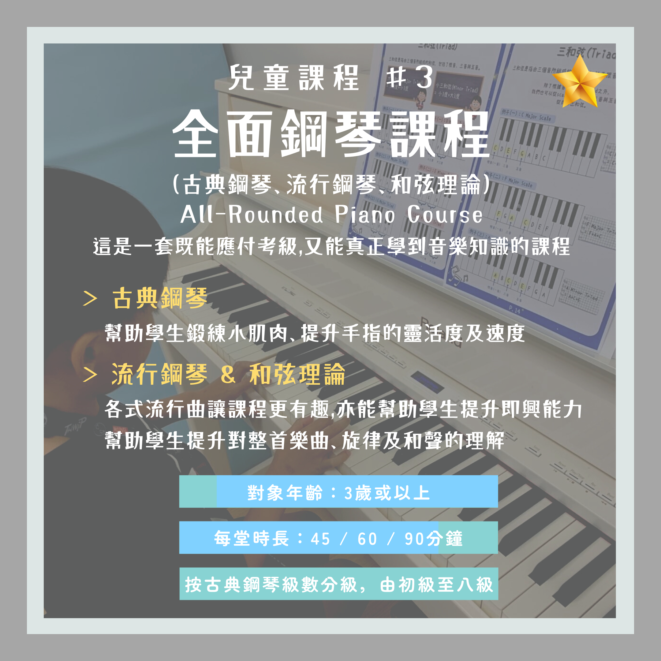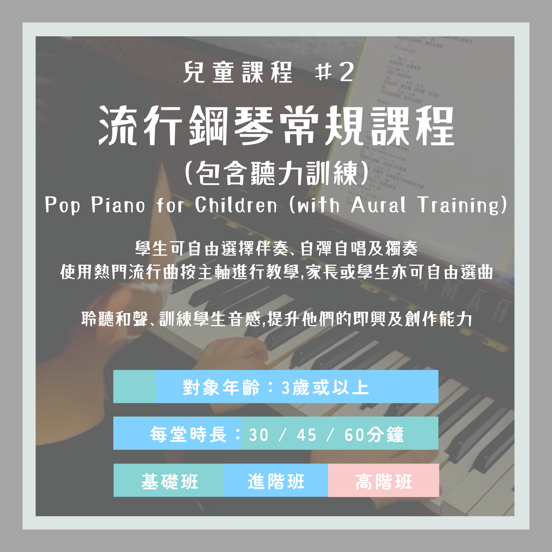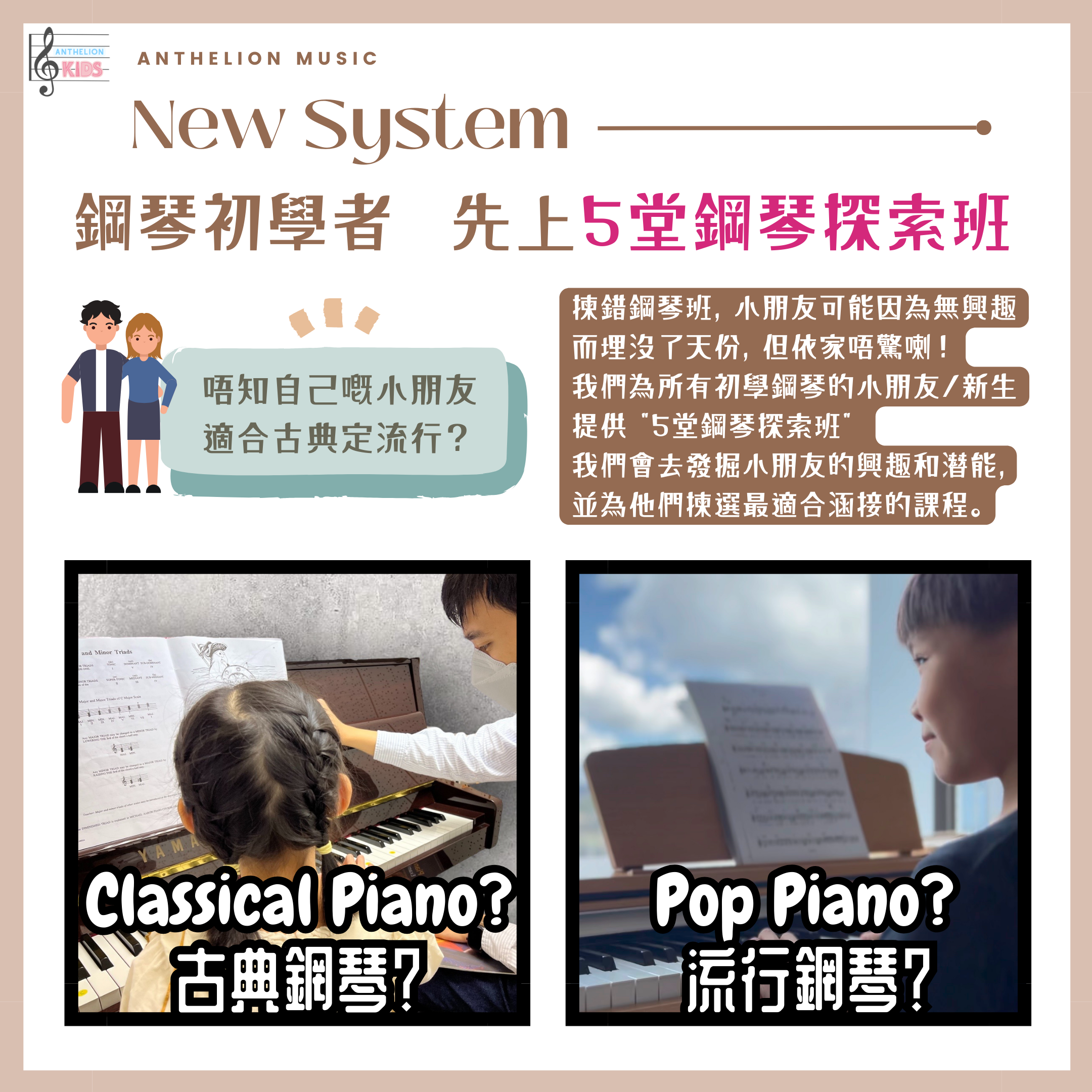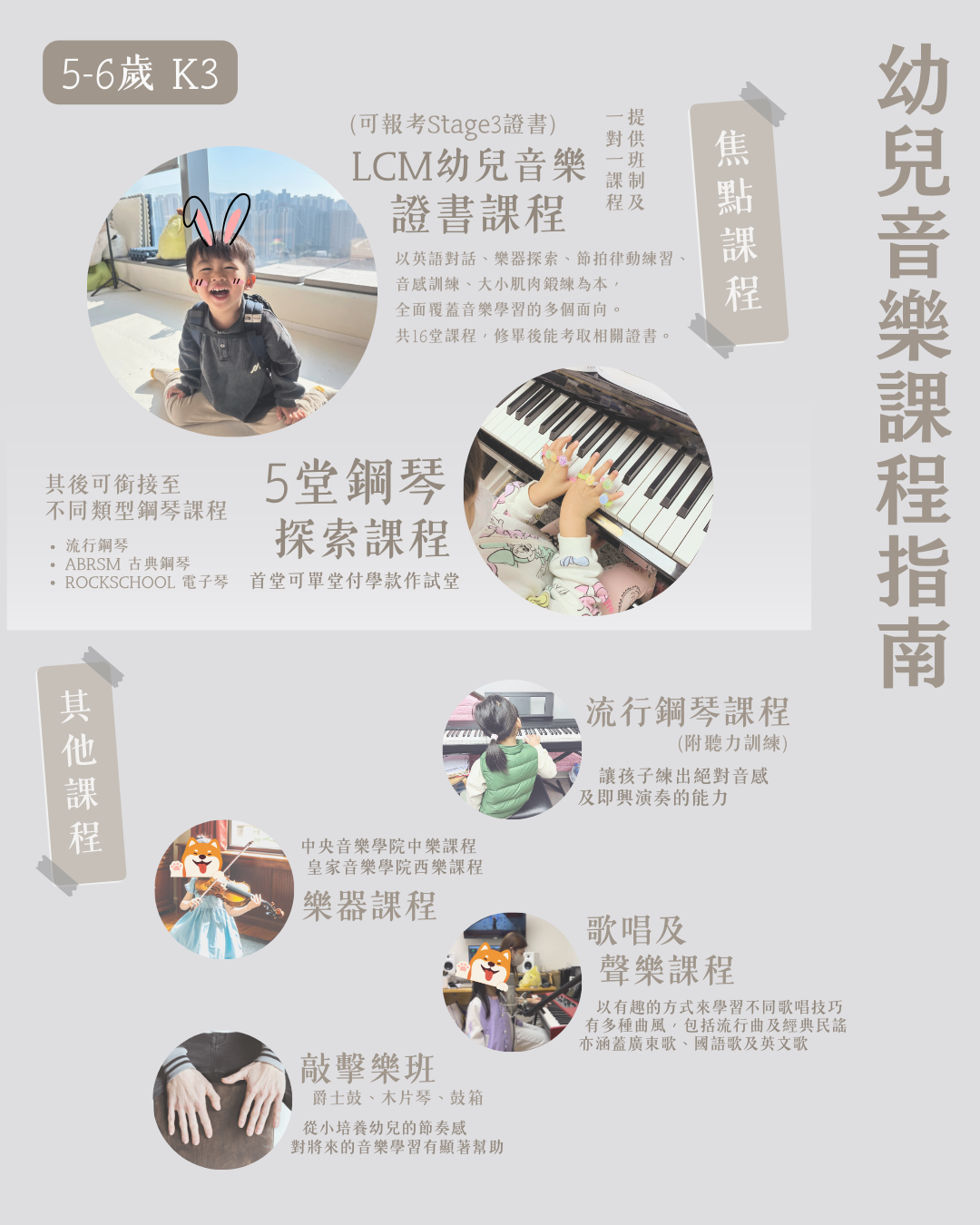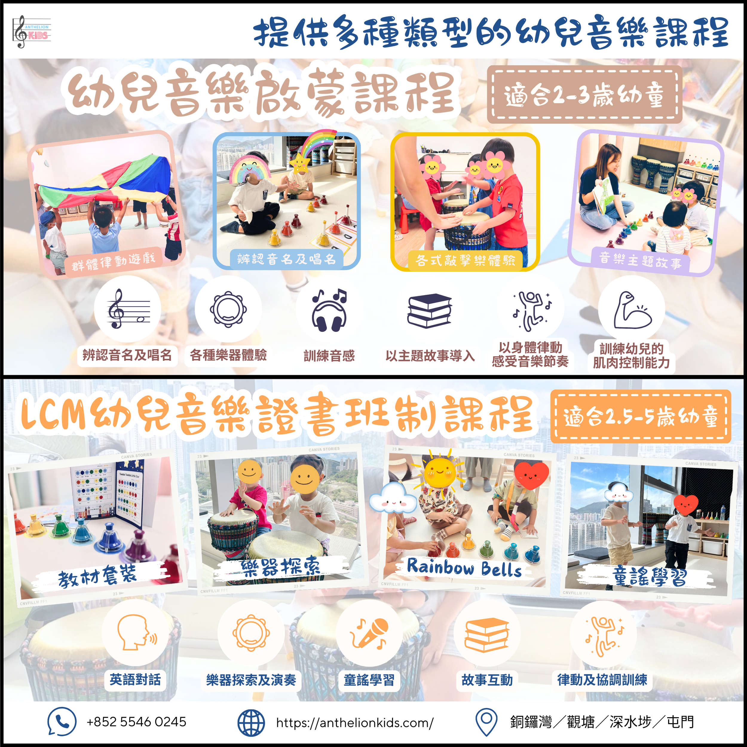 各幼兒班制課程全年招生班制課程分齡上課讓每位同學之間可以得到更好的互動網站把課程按年級分頁讓家長查看課程時能夠一目了然 直接點撃以下按鈕,查看各年齡幼兒所適合的課程 2-3歲課程(升N班) 3-4歲課程(升K1) 4-5歲課程(升K2) 5-6歲課程(升K3) 5堂鋼琴探索班 按我了解更多 Tier-3一對一鋼琴課程(3-12歲) 流行鋼琴課程 按我了解更多 古典鋼琴課程 按我了解更多 全面鋼琴課程 按我了解更多 除了幼童課程外我們還提供一系列成人及青少年流行音樂課程按以下按鈕轉至Anthelion Music 按此進入