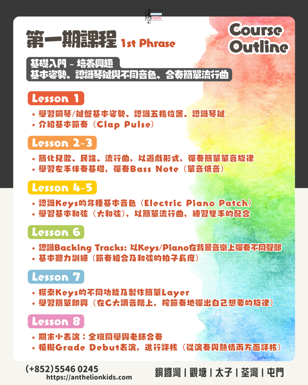 讓孩子在快樂的群體環境下,學習彈奏自己喜歡的廣東流行曲、K-Pop、電影音樂等等,同步掌握鋼琴伴奏技巧及現代電子鍵盤效果器的應用。
