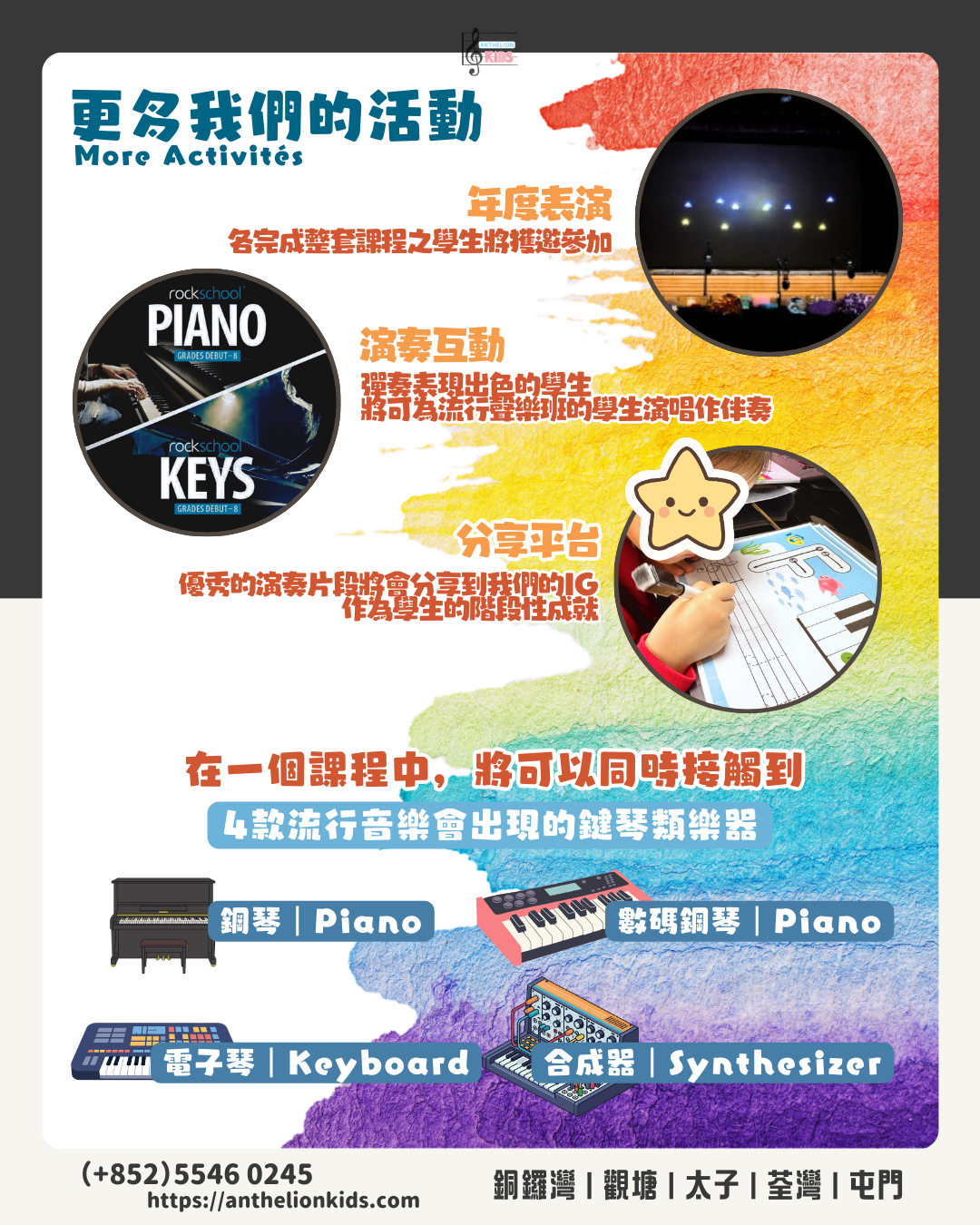 3. 自然融入全面的音樂及樂理訓練(和弦知識、聽力訓練、視奏、即興演奏),讓孩子真正「懂音樂」而不單只是「會彈」,我們相信這是這世代每位孩子需要具備的能力