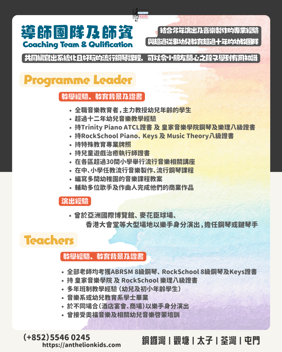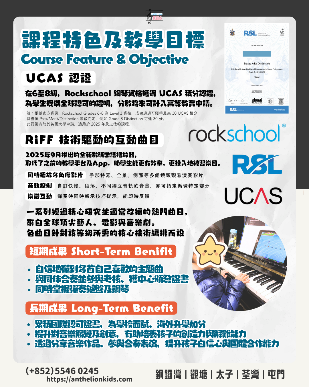 課程以Rockschool(RSL Awards)流行音樂考級為核心,全球超過百萬人報考Rockschool,具相當認受性及國際認可(Ofqual監管,Grade 6-8有UCAS分數),在香港中小學面試或海外升學的優勢大。