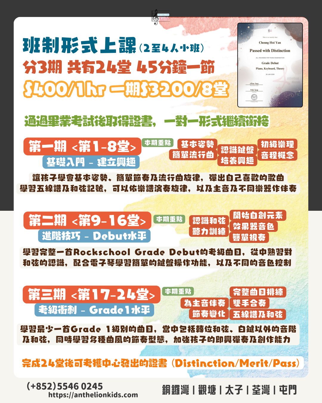 完成三期課程後,我們將有提供畢業考試,按學生表現頒發由Pass、Merit到Distinction的畢業證書,內容對應RockSchool Syllabus,家長能清楚看見孩子的進度。
