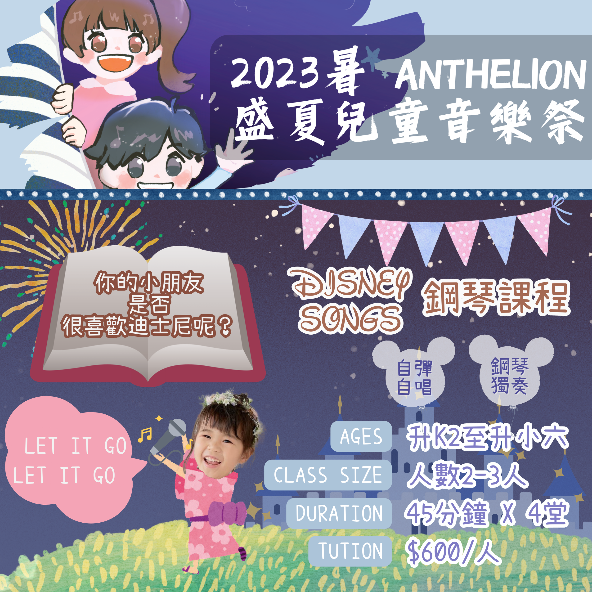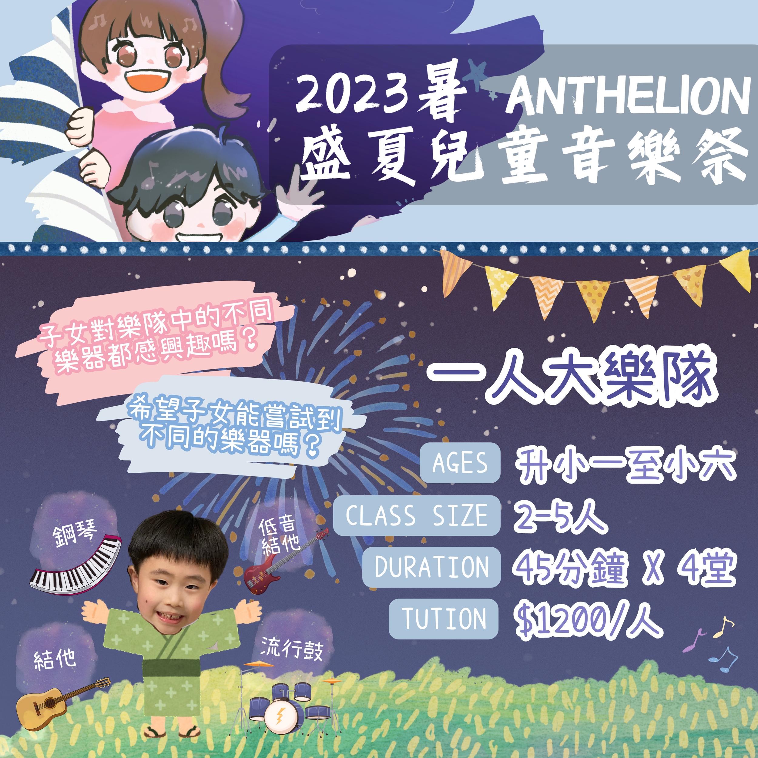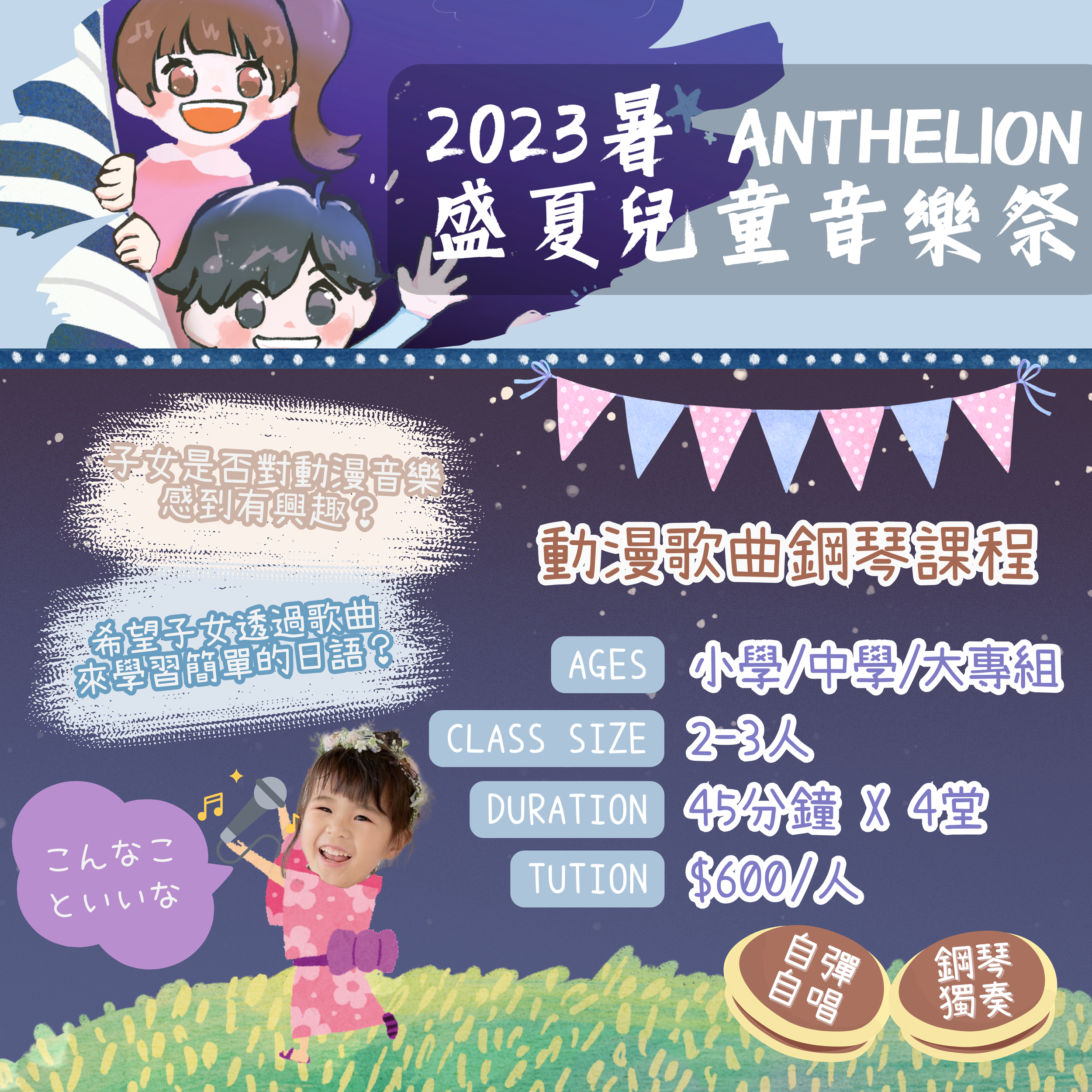以下課程按歲數排列 按我了解更多 4堂短期課程 迪士尼主題曲自彈自唱/獨奏課程 按我了解更多 日劇/日本動漫主題曲自彈自唱 x 日語發音課程 按我了解更多 自選流行曲課程自彈自唱 連COVER拍攝 按我了解更多 單周課程(4天/5天) 一人大樂隊4堂學4種樂器 按我了解更多 啟蒙音樂小世界幼兒音樂啟蒙課程 按我了解更多 查看更多詳情 除了小童課程外我們還提供一系列的成人及青少年流行音樂課程按以下按鈕轉至Anthelion Music 按此進入