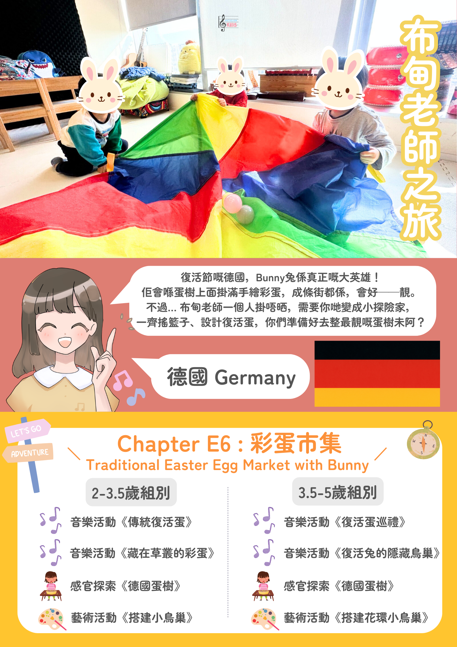 德國在復活節期間,每個家庭都會把彩蛋掛在樹上,小朋友將可按指示設計出一隻音樂彩蛋!彩蛋樹將會集結在彩蛋市集,小朋友不單能展示自己的作品,亦需要合作尋找隱藏的彩蛋,同時協力搭建小鳥巢!
